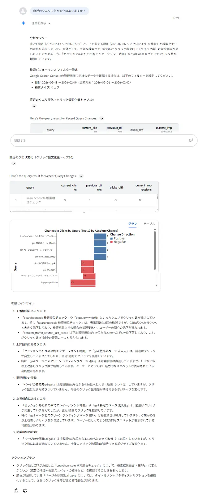 つまり、Search Consoleのテーブルを指定することで、SQL を一行も書かずに、Google Search Console の膨大なデータを自然言語で深掘りすることが可能になる。