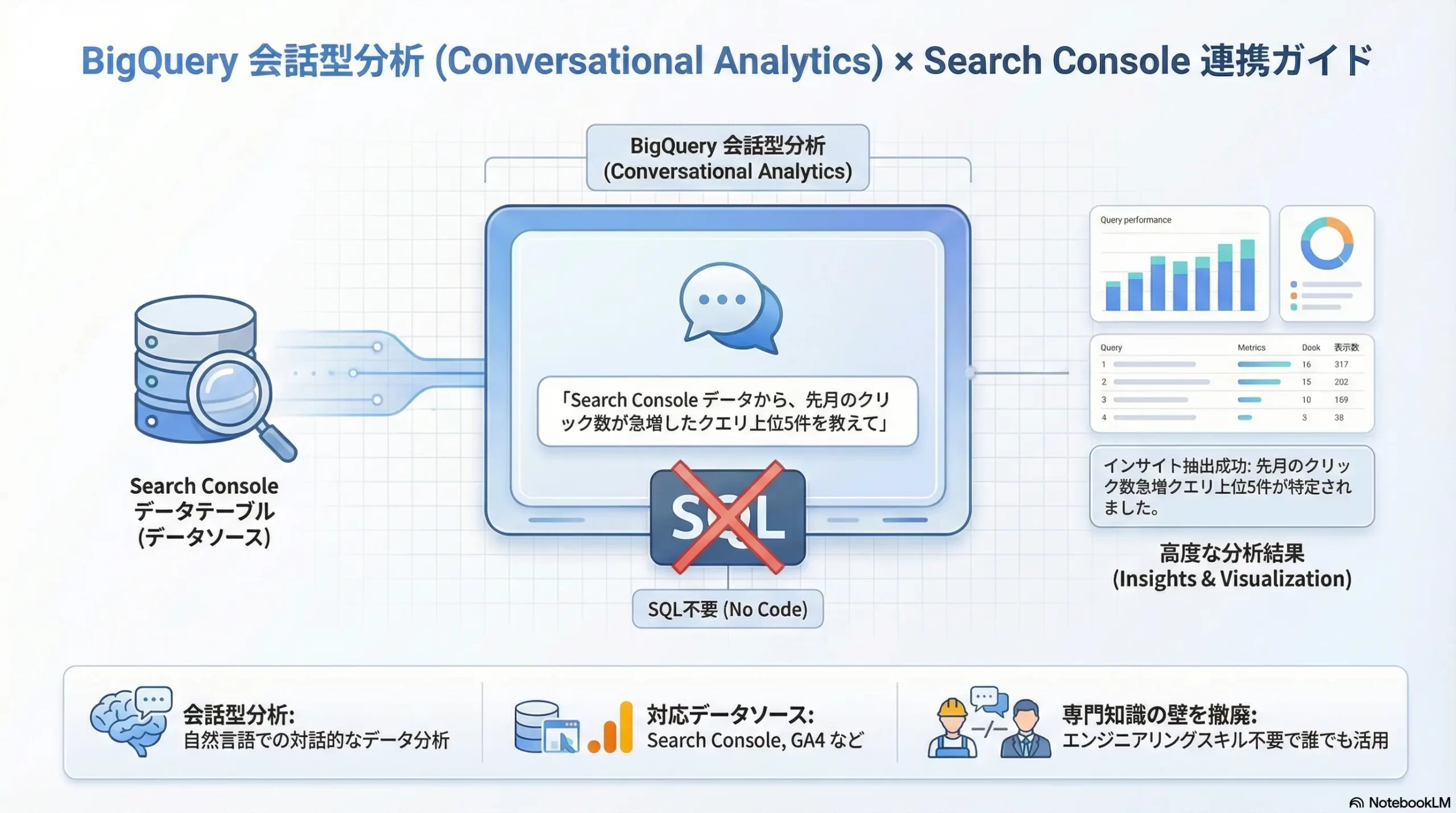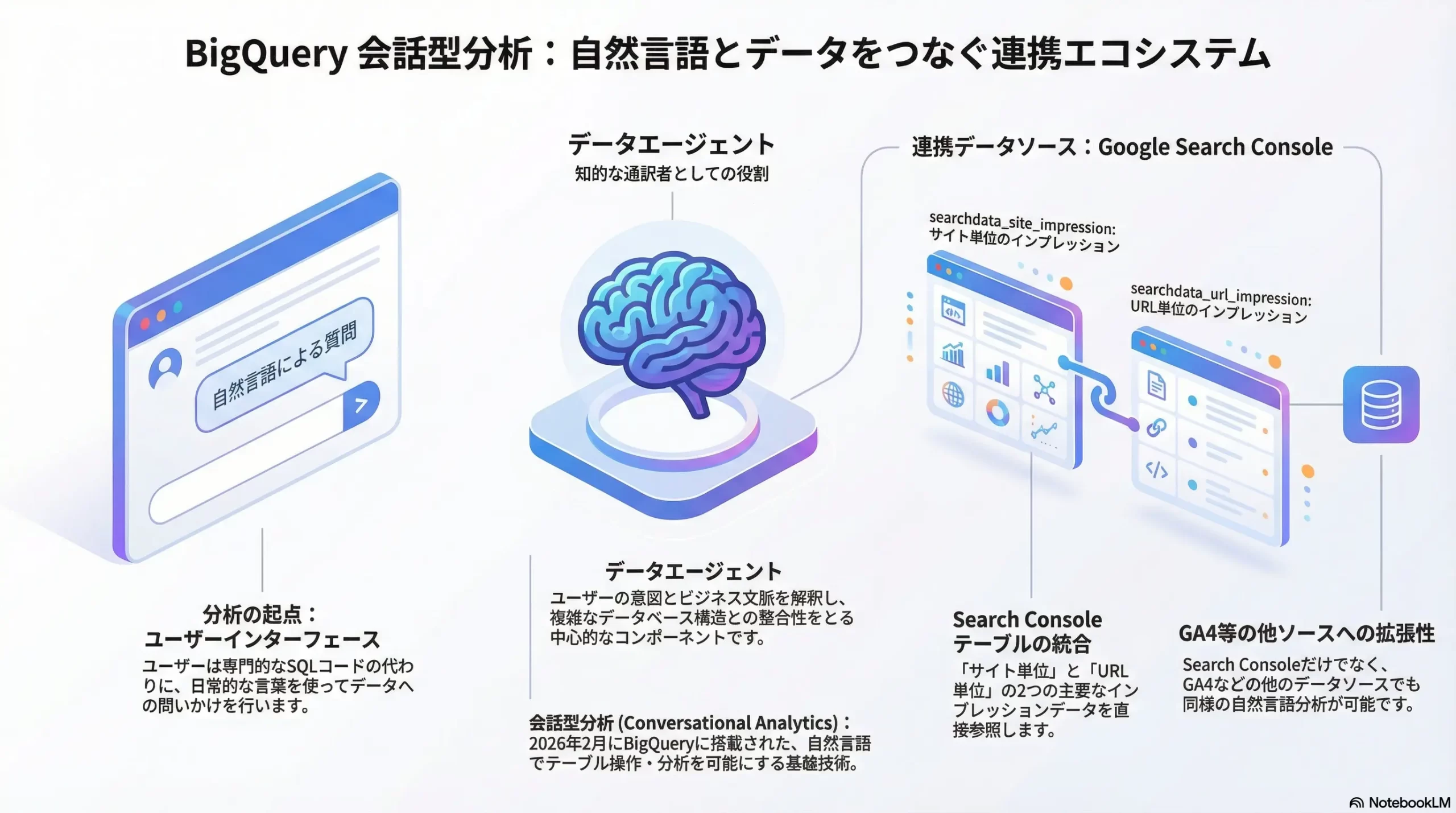 BigQueryで自然言語でテーブルにアクセスできデータ分析できる機能が2026年2月にBigQueryに搭載された。この機能は会話型分析(Conversational Analytics)と呼ばれる機能で、分析にあたっては、BigQueryのデータソース(テーブル)を指定する必要がある。当記事ではSearch Consoleを事例として解説するが、GA4でも同様のデータ分析が可能になる。
