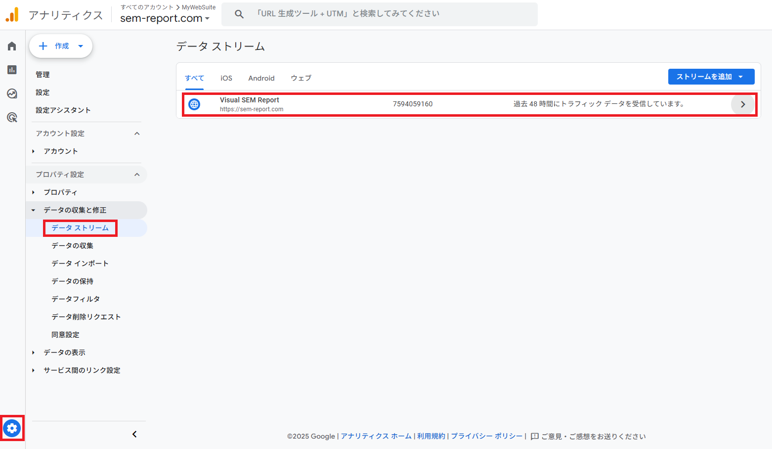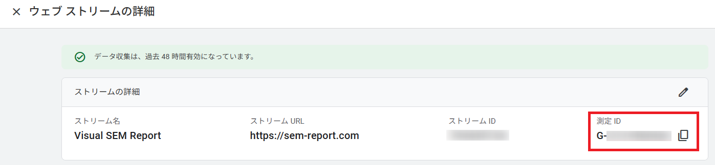 UAの「UA-XXXXXX-1」に相当する概念であるが、GA4では プロパティの中に複数のデータストリームが存在し、ストリーム単位で 測定ID(Measurement ID) が発行される という点が異なる。